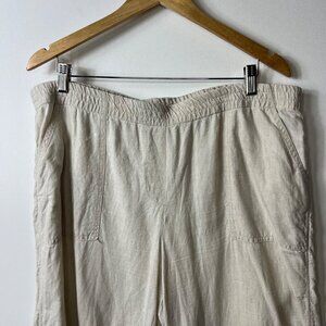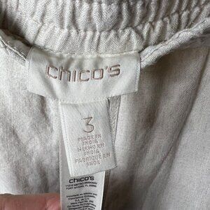 Elevate your wardrobe with these Chico's linen pants in a beautiful cream color. These pants feature a wide-leg style and flat front, making them perfect for any occasion, whether it's casual, workwear, or travel. The elastic waistband ensures comfort, while the pockets add convenience. These pants are machine washable and made from breathable material, making them perfect for summer, fall, or spring. The pants come in a women's size 3/XL and are solid-patterned with a bohemian nature and beach theme. The Chico's brand guarantees quality, and these pants are no exception. They are perfect for those who want to look stylish while staying comfortable. Add these dress pants to your collection today!