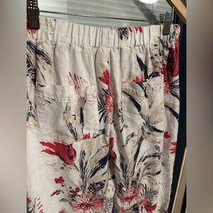 Chicos 100% linen size 1 white with pink blue floral straight leg baggy summer pant. Excellent used condition. No holes. A few pulled threads spots, pictured. Back waistband has some stretch. Pockets on the back only.