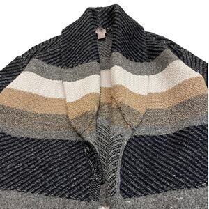 Wrap yourself in effortless style with this Chico’s size 1P (MP) open-front cardigan, featuring bold horizontal stripes in versatile neutrals — black, grey, camel, and cream. The cozy shawl collar and midweight textured knit make it perfect for layering through fall and winter.
