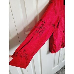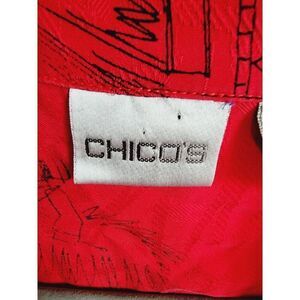 This Chico's blouse is a classic fit with a collared neckline and button closure. The long sleeves have a casual sleeve type and come in a size L. The shirt features stick figure drawings in red and black colors, with chest pockets as accents. It is made of 100% silk material, with a lightweight and all-season features.