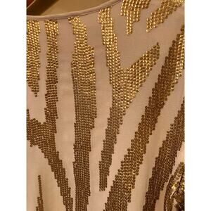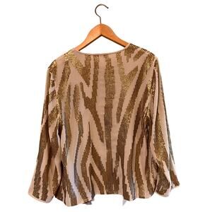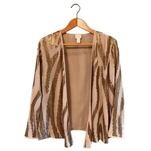 Chico's 2 Beige Tan Gold Sequin Open Front Jacket Cardigan Long Sleeve Holiday