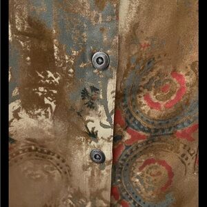 Button up top fall colors, two front pockets, cute worn open with a tank or tee. Feels like suede but it is polyester. Measures approximately pit to pit 22” length 25.5”