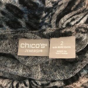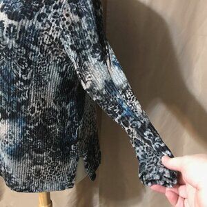 This Chico's Zenergy sweater is in excellent preowned condition. It’s marked as a Chico's size 2 which is equivalent to a 12/14 per the size tag. The fabric is a soft rayon blend in a really cool pattern. It has shades of blue, gray and hints of black that give an animal print snake skin vibe. It has long sleeves and a beautiful cowl neckline.