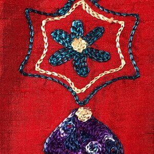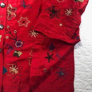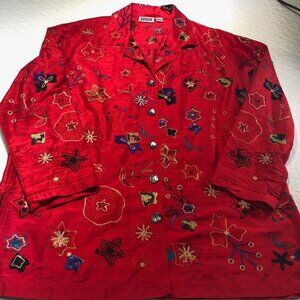 Chico's 2 Design Women's (L/12) Red Silk Gold Floral Embroidered Blouse Top L/S