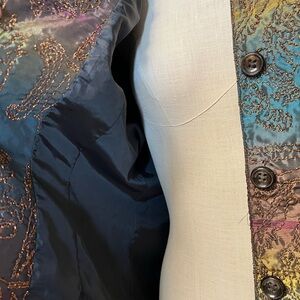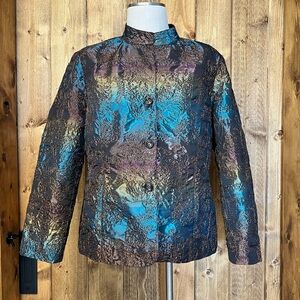 Chico’s metallic blazer, iridescent blazer women, brown and teal jacket, military style blazer, embroidered blazer, structured blazer women’s large, bronze metallic embroidery, statement jacket, fall fashion blazer, chic evening jacket, fully lined blazer, dressy outerwear, holiday party blazer, boho glam blazer, eclectic fashion piece, vintage inspired blazer, luxe layering piece, tailored women’s blazer, artsy