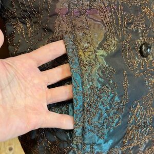 This striking Chico’s blazer is a true statement piece, featuring an iridescent blend of rich brown and teal tones with an all-over dark bronze metallic embroidered pattern.