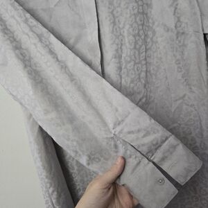 Stylish gray button-up shirt with a subtle leopard print. Perfect for casual or formal occasions. Features long sleeves and a classic collar.