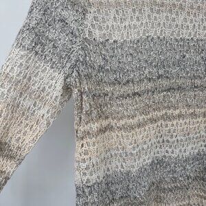 This women's knit top by Chico's offers a stylish layered design in beige and gray hues. The blend of cotton and polyester ensures both comfort and durability, making it versatile for cooler seasons. Its relaxed fit and elegant look cater to various style preferences.