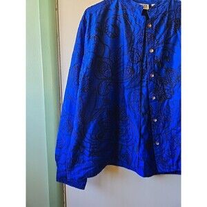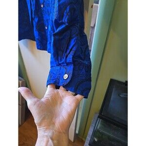The Chico's 2/L Women's Blue with Black Embroidered Jacket is a vibrant and elegant piece perfect for various occasions. Made from 100% silk with a polyester lining, this button-down jacket features a paisley pattern and embroidered accents, adding a touch of artistry to your wardrobe. With a short length and long sleeves, this jacket is suitable for all seasons and is designed for a regular fit. Whether you're traveling, attending a party, or wearing it for casual or business purposes, this jacket is sure to make a statement with its colorful and bohemian style.
