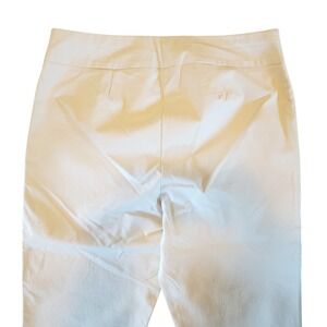 These Chico's 2.5 So Slimming Pants are in a solid beige color with a pull-on closure and a tapered leg style. Made from a blend of spandex, rayon, and cotton, the pants feature a slim fit and high rise waist of 36 inches. With a flat front design and stretch fabric, these ankle-length pants are suitable for various occasions like travel, parties, casual outings, and business settings. The Chino fabric type and slimming feature make them versatile for styling in winter, summer, fall, and spring, perfect for a beach, city, or preppy themed look.