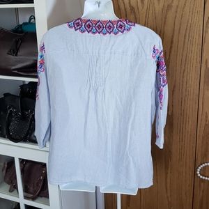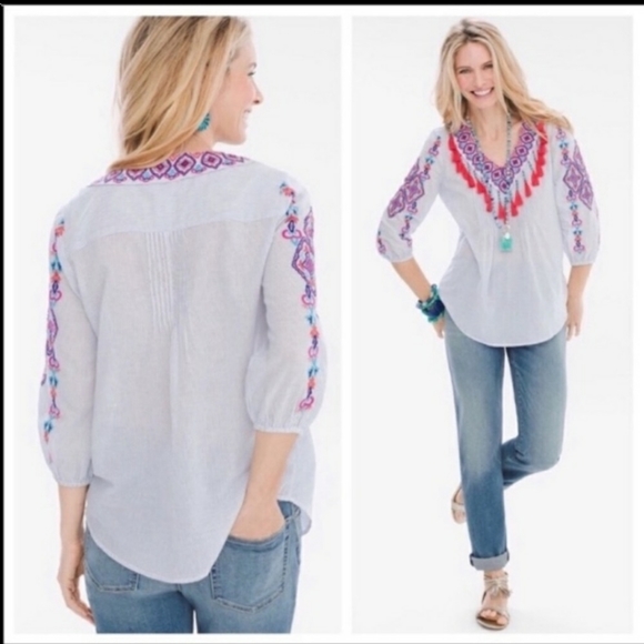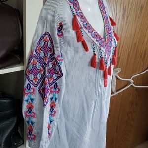 Chicos 2p blue stripe embroidered top tassles L