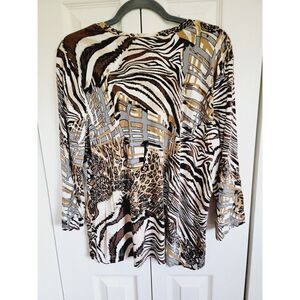 Chico's 3 Animal Prints T-Shirt 3/4 Sleeve Stretch Top XL V-Neck