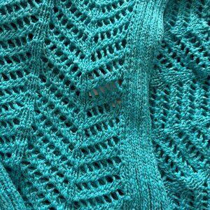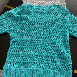 Chico's (3) equivalent to X-Large per Chico's website. Full Crochet Top. Turquoise. Excellent preowned condition. Ribbed at ends of sleeve and around bottom. Approx. measurements: pit to pit 24", shoulder to bottom 24".