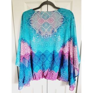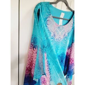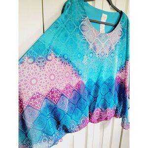 Chico's 3 Handkerchief Top Blue Pink Round Neck Size XL Gathered Hemline SS