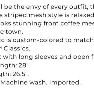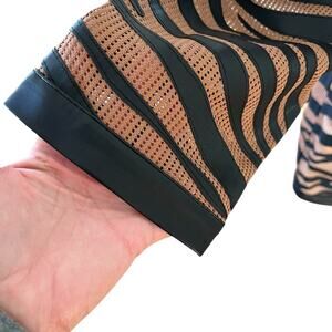 Chico’s 3 (L 16) Women's - animal stripe white jacket. Color is a medium brown with black pleather stripes. The fabric is perforated. Made of 100% polyester. Very stylish and dressy.