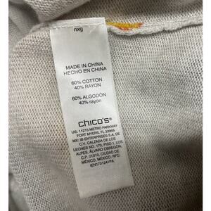 This Chico's knit top in size L features a vibrant multicolor floral pattern, perfect for a casual occasion. The 3/4 sleeves and scoop neckline offer a comfortable and stylish look, while the pullover style and rayon blend material provide a relaxed fit. With a colorful and eye-catching design, this top is a versatile piece that can be worn in all seasons, making it a great addition to any wardrobe for a pop of color and style.
