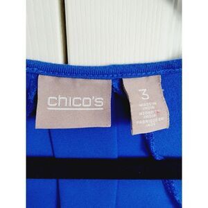 Elevate your wardrobe with this designer Chico's knit tee top. With a vibrant royal blue color and a comfortable stretchy fabric made from a blend of rayon, spandex, and poly, this top is perfect for any occasion, whether it's casual, travel, or workwear. The hi-lo crew neck design and short sleeves make it a great choice for any season, be it winter, summer, fall, or spring.