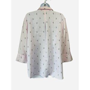 Chicos 3 Top No Iron 100% Linen Shirt XL Pink White Striped Hummingbird Print Button Up 3/4 Sleeve
