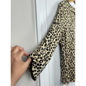 Chico's slub knit tee in size Chicos 3 (US XL) in a fun, cheetah print. Features include rounded neckline, 3/4 length sleeves, rolled sleeves with gold-buttoned tab, rounded hemline with back slightly longer than front.