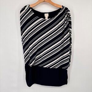 This black and white striped top by Chico's, crafted from a comfortable polyester-spandex blend, offers a stylish drape and flattering fit.