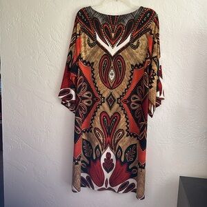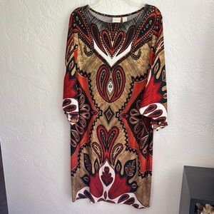 Effortless style meets easy comfort in this Chico’s 3/4 Bell Sleeve Shift Dress, size 3 (equivalent to XL). In excellent preowned condition, this gorgeous dress features a blend of warm browns, oranges, and subtle neutral tones—perfect for any season and any getaway. The relaxed shift silhouette and breezy 3/4 bell sleeves make it cool, comfortable, and classy all at once.