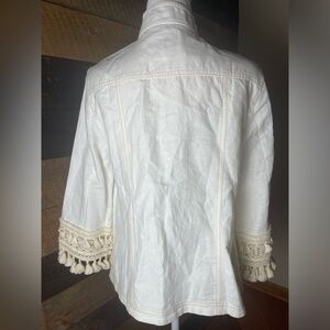 Gorgeous jacket in a lightweight linen blend, mutton front, 2 front pockets on the chest, 3/4 sleeve length, beautiful tassel detail. It's also off white with a darker tan contrast stitch detail. It is not lined