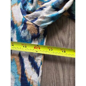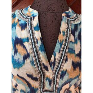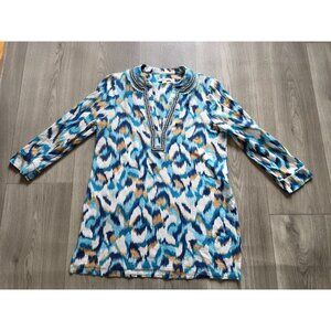 Chicos 3/4 Sleeve V-Neck Tunic Top OO/XS Blue Multicolor Ikat Pattern Beaded Tri