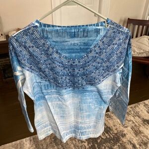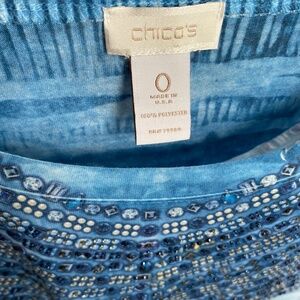 100% polyester very nice chicos top size 0 womens white and blue sparkly embroided top of shirt pictures show all very nice shirt 3/4 long sleeve shirt :) Shoulder to the bottom of the front 22 inches :)