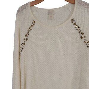 This chic ivory sweater from Chico's features eye-catching embellishments and a comfortable knit design. The long sleeves and acrylic material provide warmth, while the intricate detailing adds a touch of elegance.