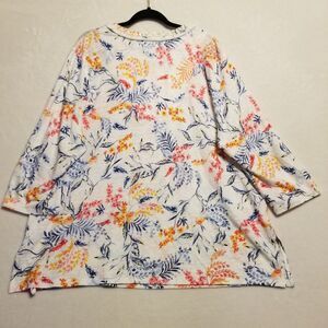 Chico's Womens Plus Size 4 (XXL) Top 100% Linen Jersey Knit Floral Tunic Beaded Fringe V Neck Beach Coastal Vacation Cruise