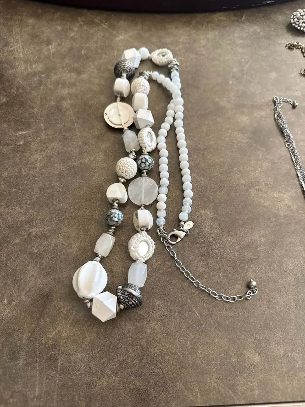 Chico's Multi-Strand Statement Necklace featuring an eclectic mix of white and textured beads. This piece combines chunky white geometric shapes, crochet-wrapped spheres, faceted clear accents, and silver-tone decorative metals for a unique bohemian look.