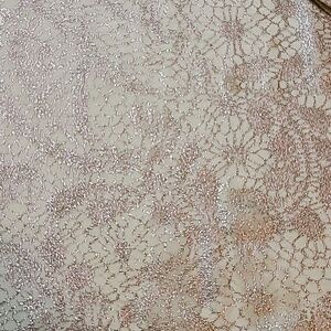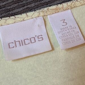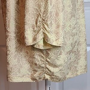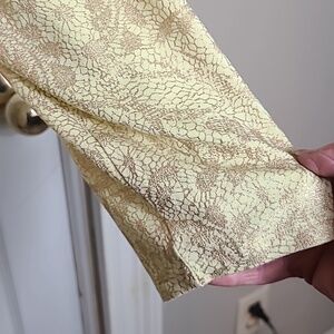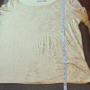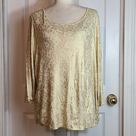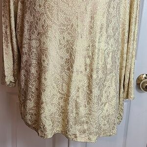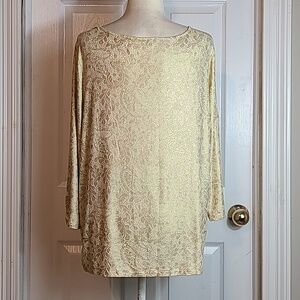 7/8 Length Sleeves, Rounded Neckline, Loose Fit Body, Light Ruschingon Ends of Sleeves, and Sides of Hemline, Very Stretchy, Yellow in Color, With Gold Metallic Abstract Print, Chico's Size 3, = Regular Size Extra Large.
