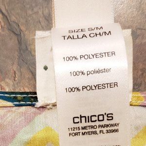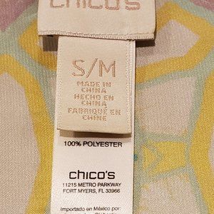 Chico's Abstract Print Poncho - size s/m. The stitched area on the sides measures about 26" across. It is larger the a a size 2 would fit and some size 3 pieces. The care instructions and fabric content is displayed in the above pictures. It is coming from a smoke free, pet friendly home, Excellent condition.