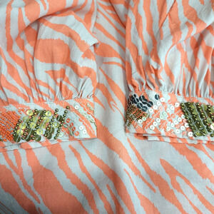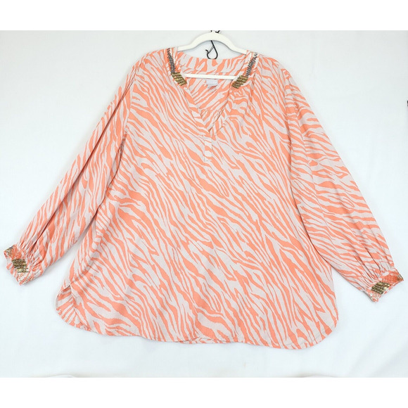 Chico's Animal Print Beaded Sequin Embellished Neck & Cuffs Modal Tunic Women XXL Long Sleeve Coral Beige V Neck