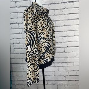 Zenergy by Chicos leopard print bomber jacket in a Chicos size 2, equivalent to a size large. Perfect light weight jacket to wear with jeans or to the gym. It has two slash pockets at the waist.