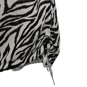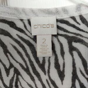 Chico's animal print cardigan sweater in women's size 2 - equivalent to a size large. Lightweight nylon/rayon blend knit is perfect for layering. Drawstrings at the side can be cinched for a draped effect. Open front. Gently pre-owned.