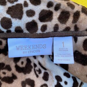 Weekends by Chico’s Animal Print Zip Up Velour Jacket/Sweatshirt. Size Small/Medium (Chicos 1). Excellent pre-owned condition! Leopard print in various brown hues. Crystal embellished grommets at the drawstring collar. Two side entry pockets. Super soft. Machine wash. Ships from a smoke and pet free home.