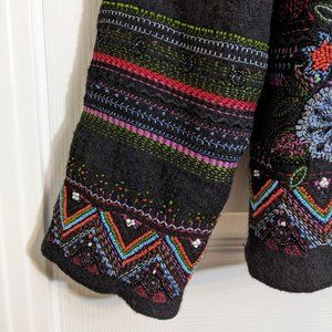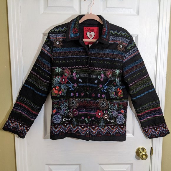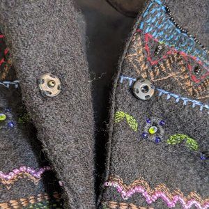 -Color/pattern: black 100% wool button front jacket with colorful floral embroidery & beadwork