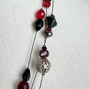 - 3 strand necklace with red, burgundy, black and silver tone beads