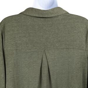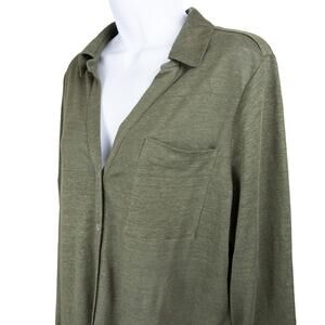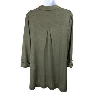 Chico's Army Green Button Down Tunic Knit Top Medium. 100% Linen, soft, knit. Collared, v-neck button down women's blouse. Split hem, 3/4 roll tab sleeves. Excellent condition, no tears, stains or obvious flaws.