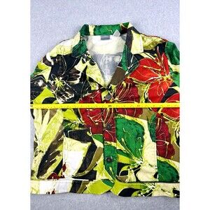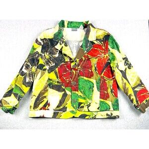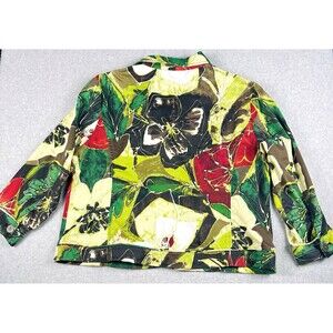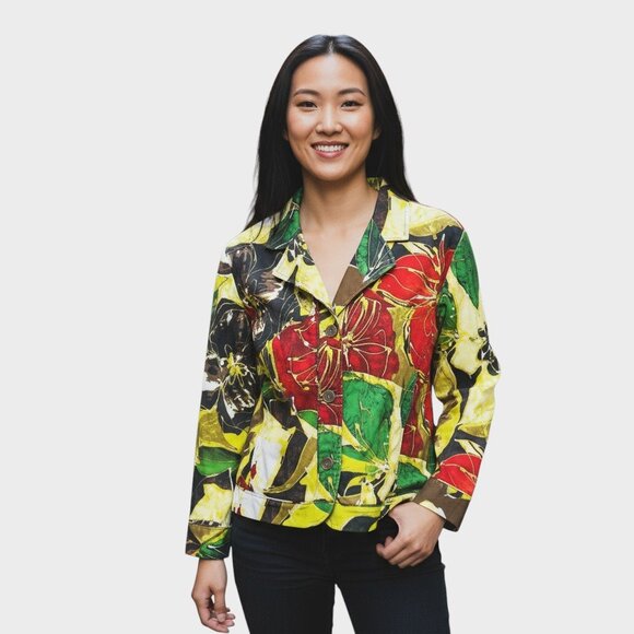 A vibrant Chico’s Art to Wear blazer featuring bold multicolor florals, a structured cotton-blend feel, and a classic button-front design. A standout layer perfect for office looks or artistic everyday styling.