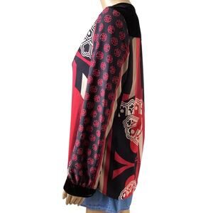 V-neckline with black velvet trim, velvet trim on the cuffs, and a vibrant pattern in red, black, and cream with Asian-inspired motifs.