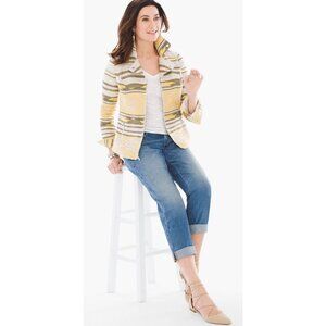 Experience the perfect blend of style and comfort with the Chico’s Aztec Jacquard Moto Jacket. This yellow Southwest full zip and lined jacket is a Chico's size 1 which equates to a size medium and was originally priced at $139.