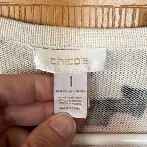 This sweater is made by Chico’s. It’s a black and red tribal looking print. Long sleeve and open front with no closures. Chico’s size 1 (see size chart) and in very nice pre owned condition. Smoke and pet free home.