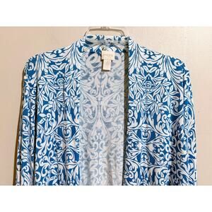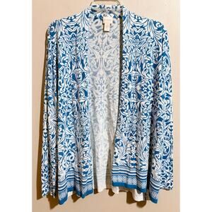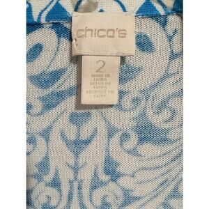 Elevate your wardrobe with this beautiful Chico's azure blue and white cotton knit open-front cardigan. The lovely paisley-like print adds a touch of elegance to any outfit. Perfect for layering and providing a comfortable fit.