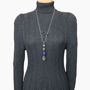 Chicos Beaded Pendant Necklace Tags Blue Silver Tone Pull Adjustable Slide Chain