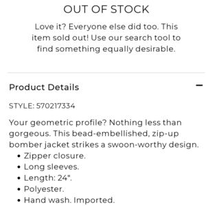 Beautiful zip-up. Retailer calls this a bomber jacket. I would also consider it to be an Embellished zip up cardigan that could be worn indoors all day and go over a variety of outfits.