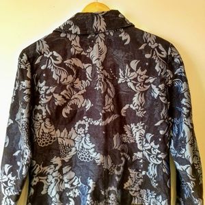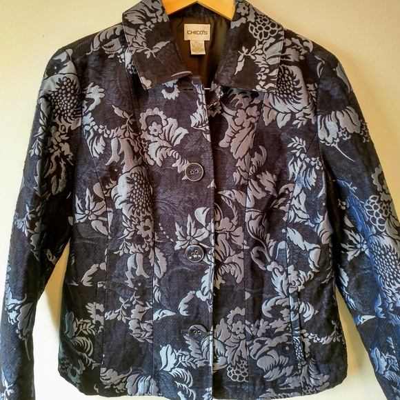 Navy blue brocade jacket, fully lined in black. Sleeve is almost 22" from shoulder to wrist and from shoulder to waist. About 18" across.