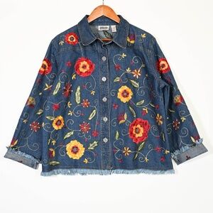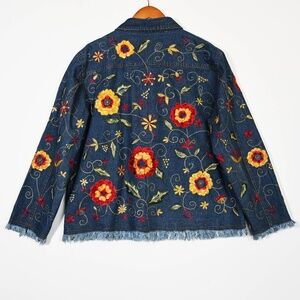 Chico’s Beautiful Whimsical Vibrant Floral Embroidered Denim jacket Sz 3 / XL/16