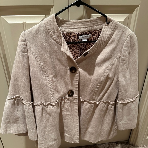 Stylish beige jacket with button-up front. Features a unique ruffled design. Perfect for layering.